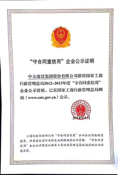 國家工商總局從歷年來各地政府或工商行政管理部門公示的“守合同重信用”企業中,選出社會誠信度、美譽度高的企業作為2012-2013年度“守合同重信用”企業向社會公示,并發出公告。中太建設集團獲得2012-2013年度“守合同重信用”企業公示資格。