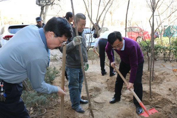 在植樹現場,大家互相配合,有的揮鍬鏟土、有的扶樹填土、有的培土澆水,進行挖坑、栽植、澆水、夯實、圈維等具體操作,忙得不亦樂乎。經過一個多小時的勞動,一株株樹苗都已“安家落戶”,為小區建設添上了一片新綠。